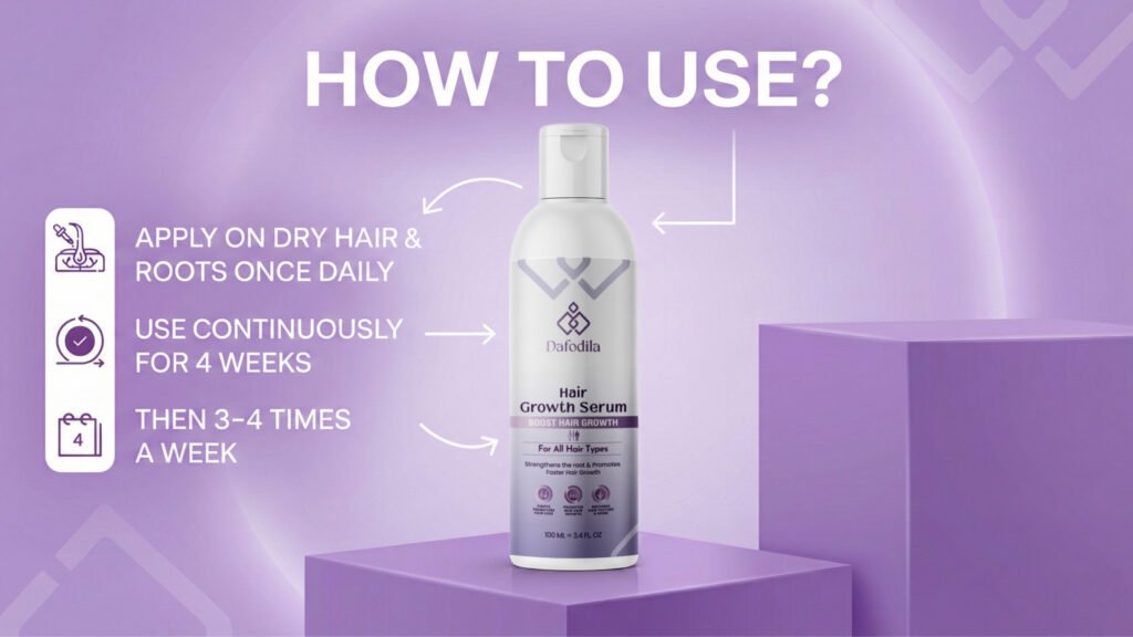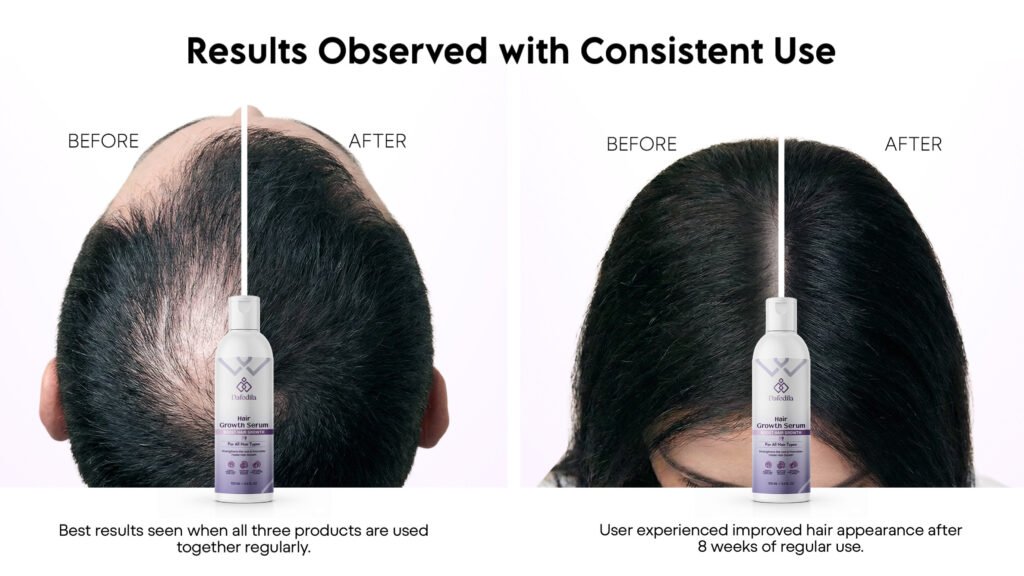 With consistent use, Dafodila Hair Growth Serum helps improve hair texture, reduce visible thinning, and enhance overall hair appearance. Users experience stronger, healthier-looking hair over time, with best results achieved through regular and disciplined application.
