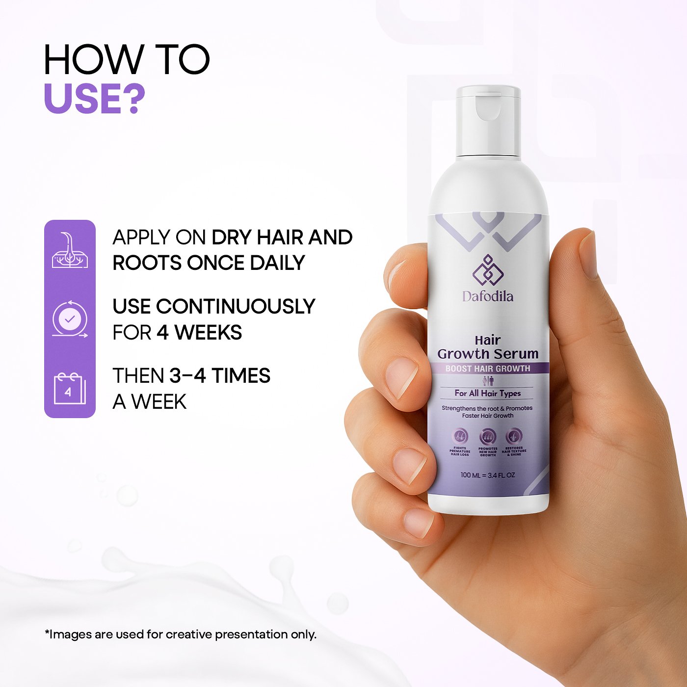 Use once daily for the first 4 weeks to support active hair growth, then continue 3–4 times a week to maintain stronger, healthier hair.